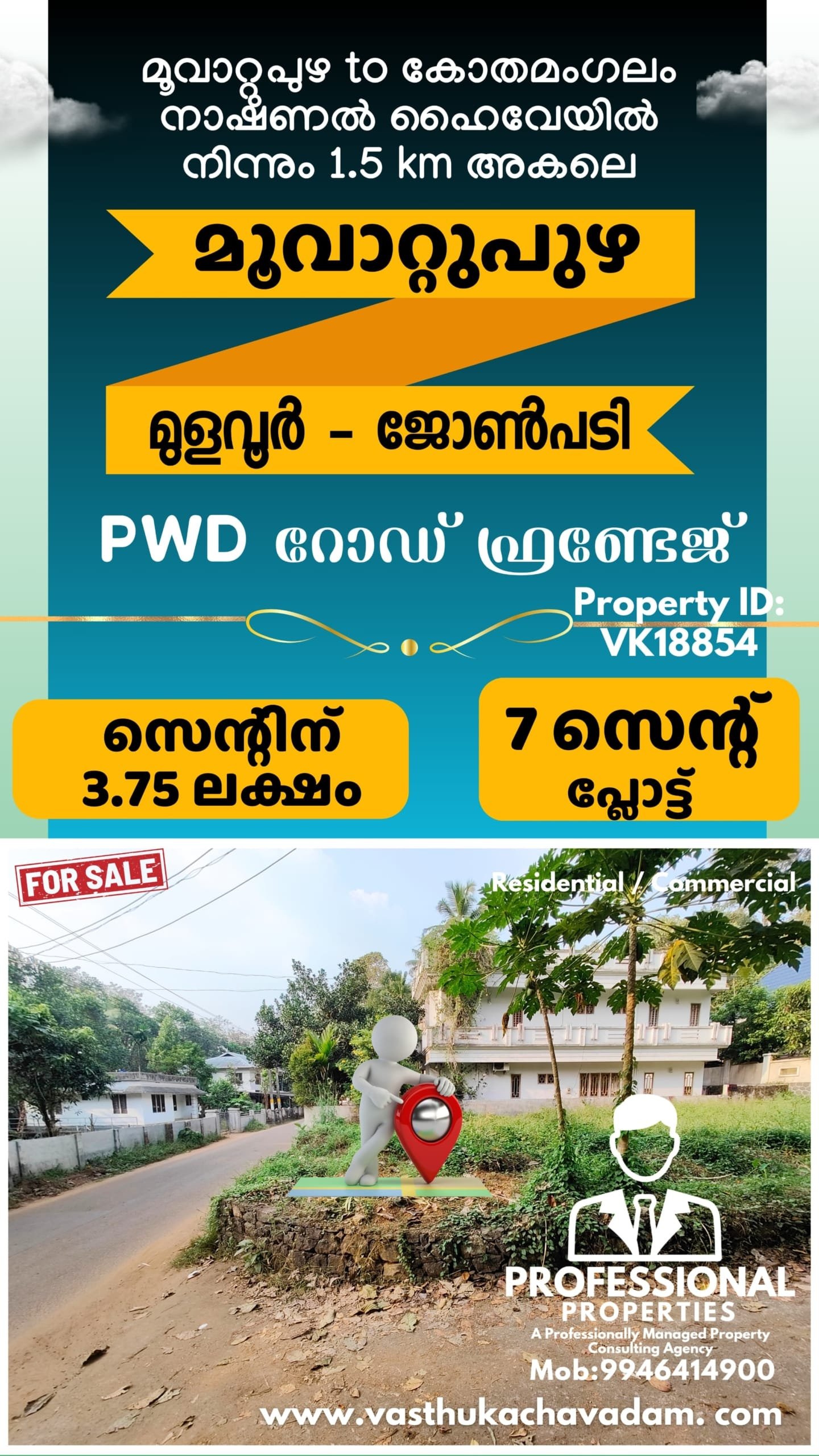മൂവാറ്റുപുഴ – മുളവൂർ –ജോൺപടി – 7 സെൻ്റ് – പ്ലോട്ട് വിൽപ്പനയ്ക്ക്. 4 LAKH/CENT. SUITABLE FOR RESIDENTIAL OR COMMERCIAL PURPOSES. ON BOTH SIDES PWD AND PANCHAYATH ROAD AVAILABLE. – 3.75 ലക്ഷം/സെൻ്റ്